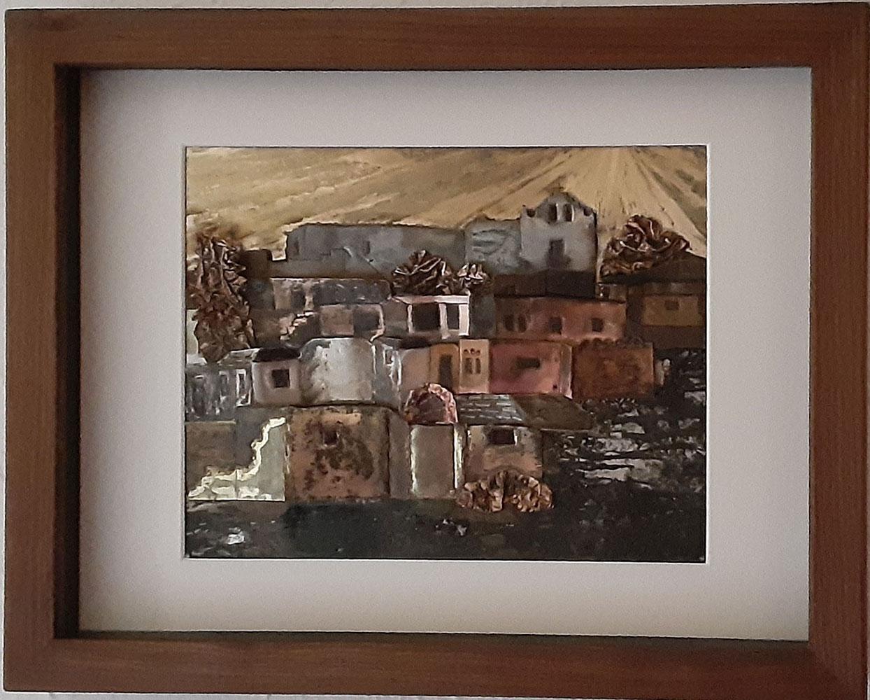 The piece is constructed from brass, copper, bronze, and nickel. The brass skyline is embossed with rays of sunshine. The piece features 4 levels of adobe structures. The uppermost layer is brushed nickel. It represents the white-washed St. Joseph Church on the horizon of the pueblo.