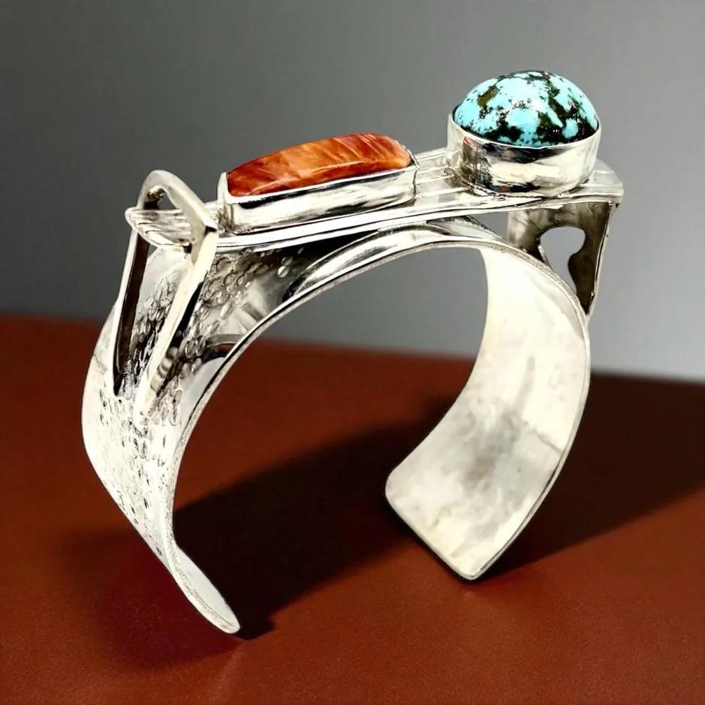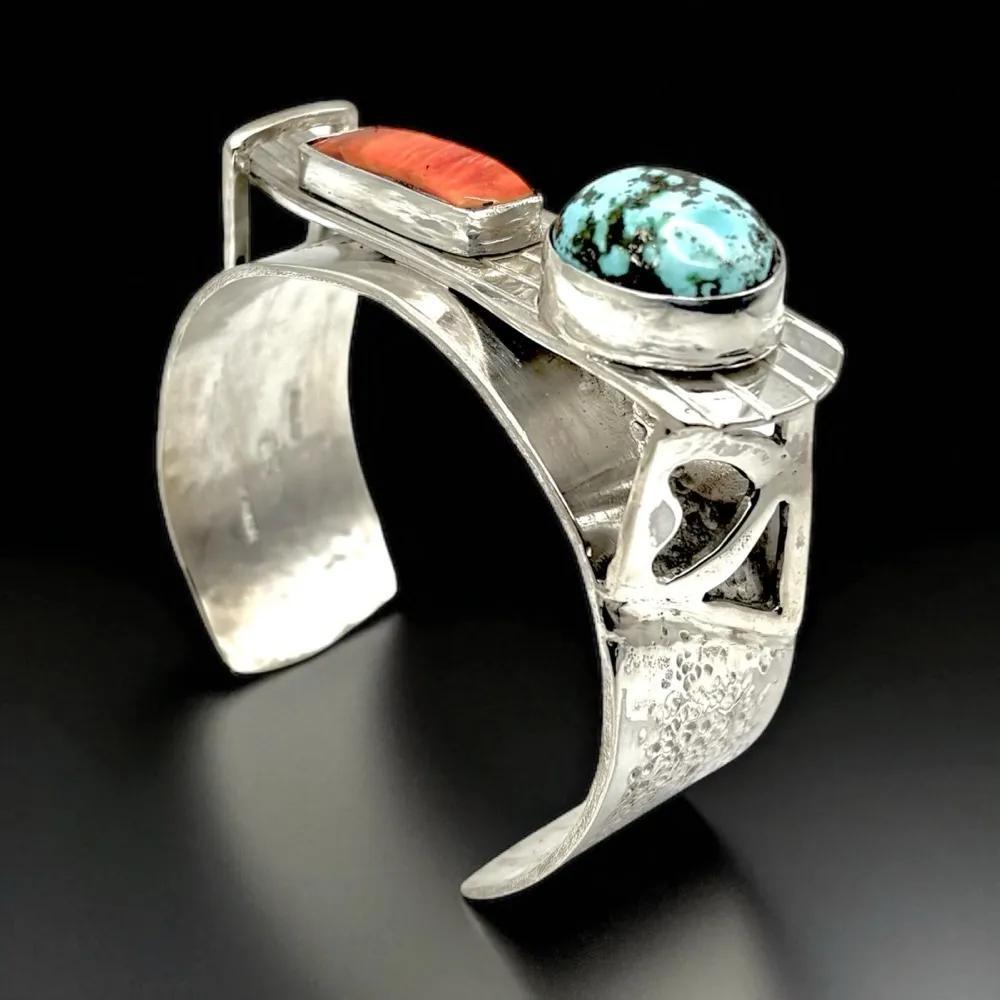 Spiny oyster, Persian Turquoise, sterling silver platinum; 2.6x2.4" 20x15mm turquoise; 25x7mm spiney oyster