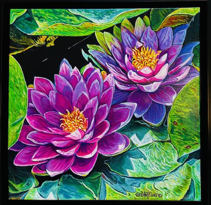 This painting is based on a photograph I took while touring the VanDusen Botanical Gardens, a 55 acre oasis in the heart of Vancouver City, Canada with over 7500 plant species. This garden, surprisingly, became a muse for my interest in water lilies. The VanDrusen gardens contains several wondering ponds filled with a myriad variety of water flowers. The beauty of which were found hiding near large lily pads. This hidden gem became one of my favorite places to walk and to get lost in my imagination for painting. Acrylic 16x16 Frame: 17.5x17.5