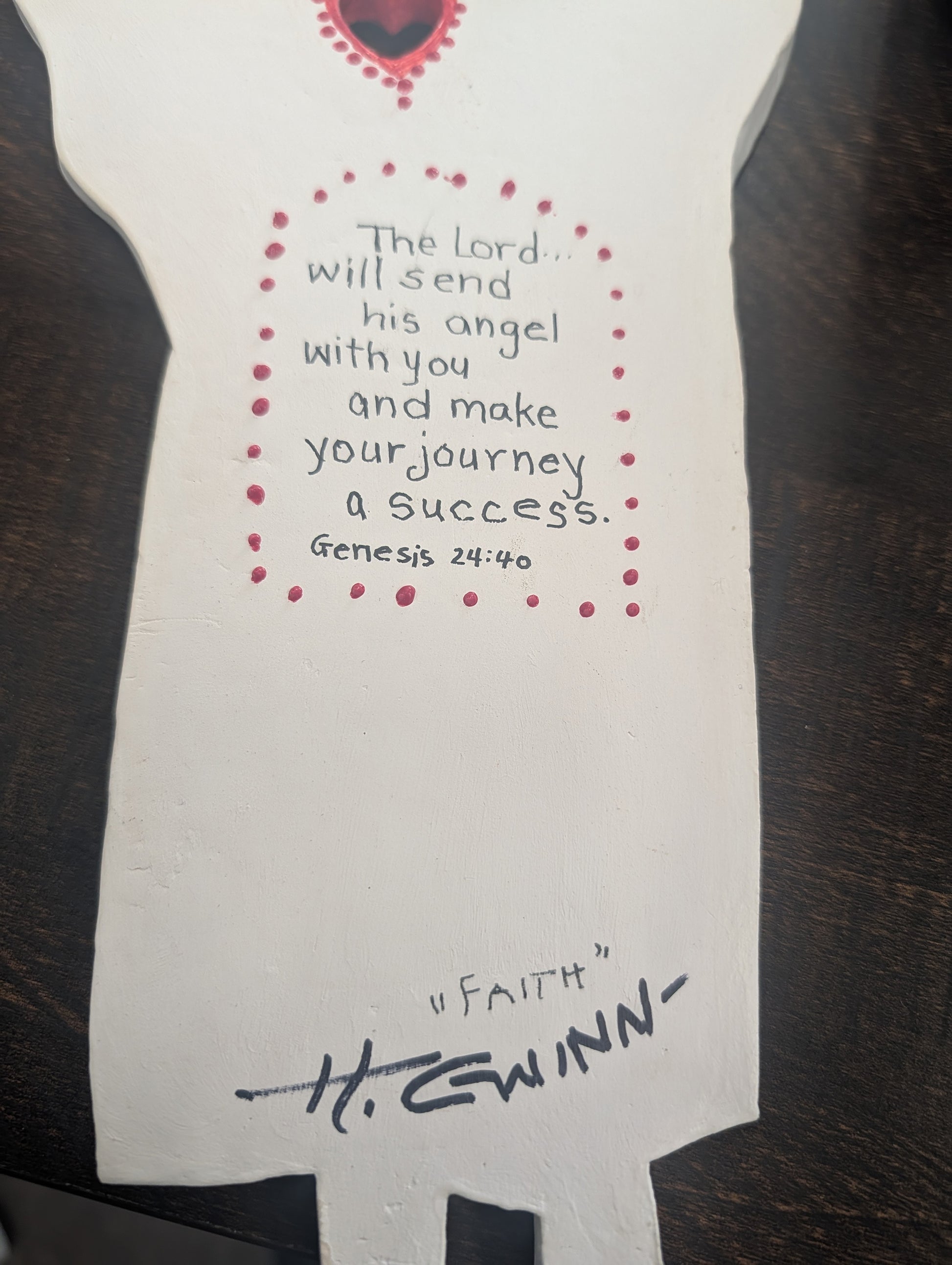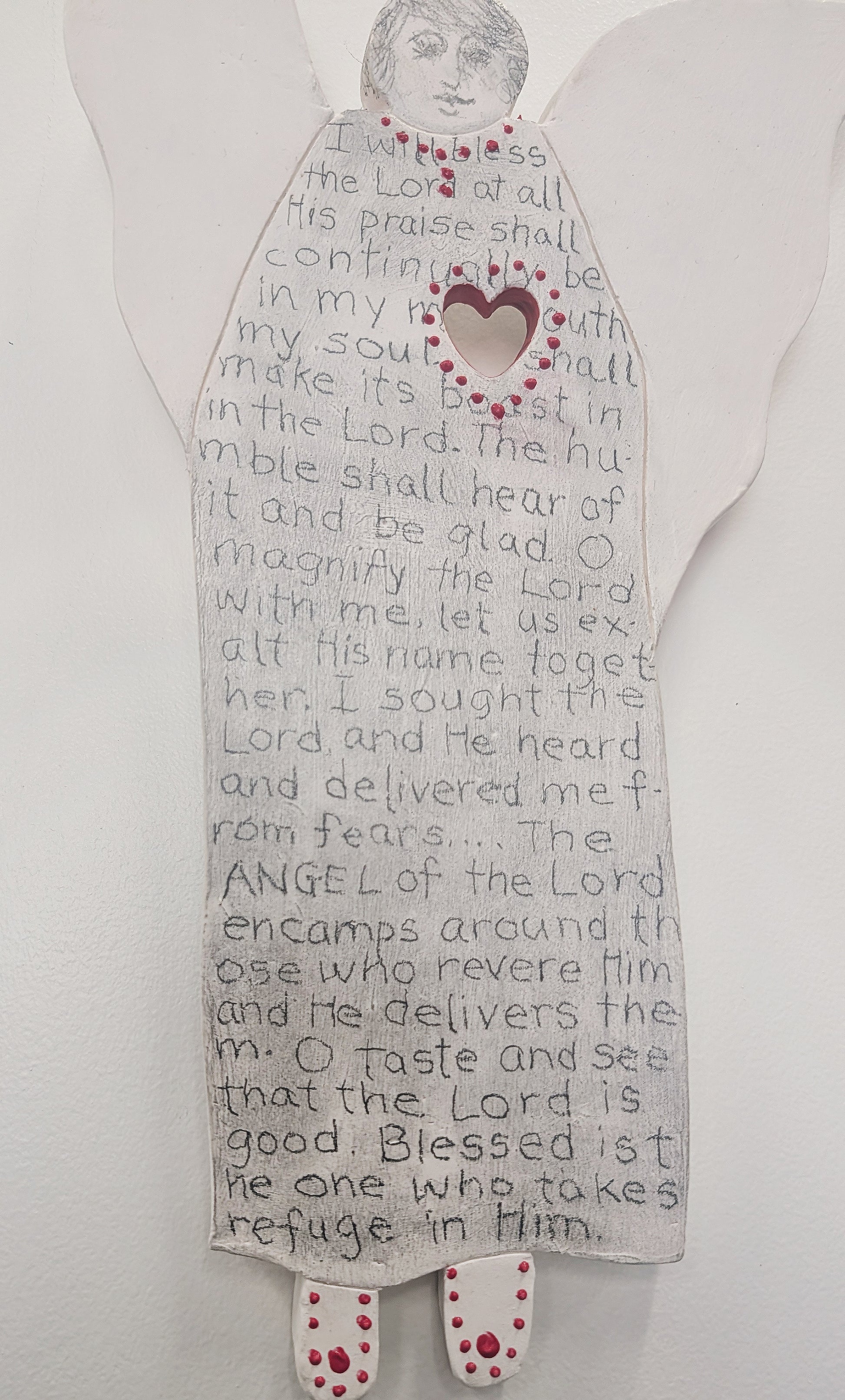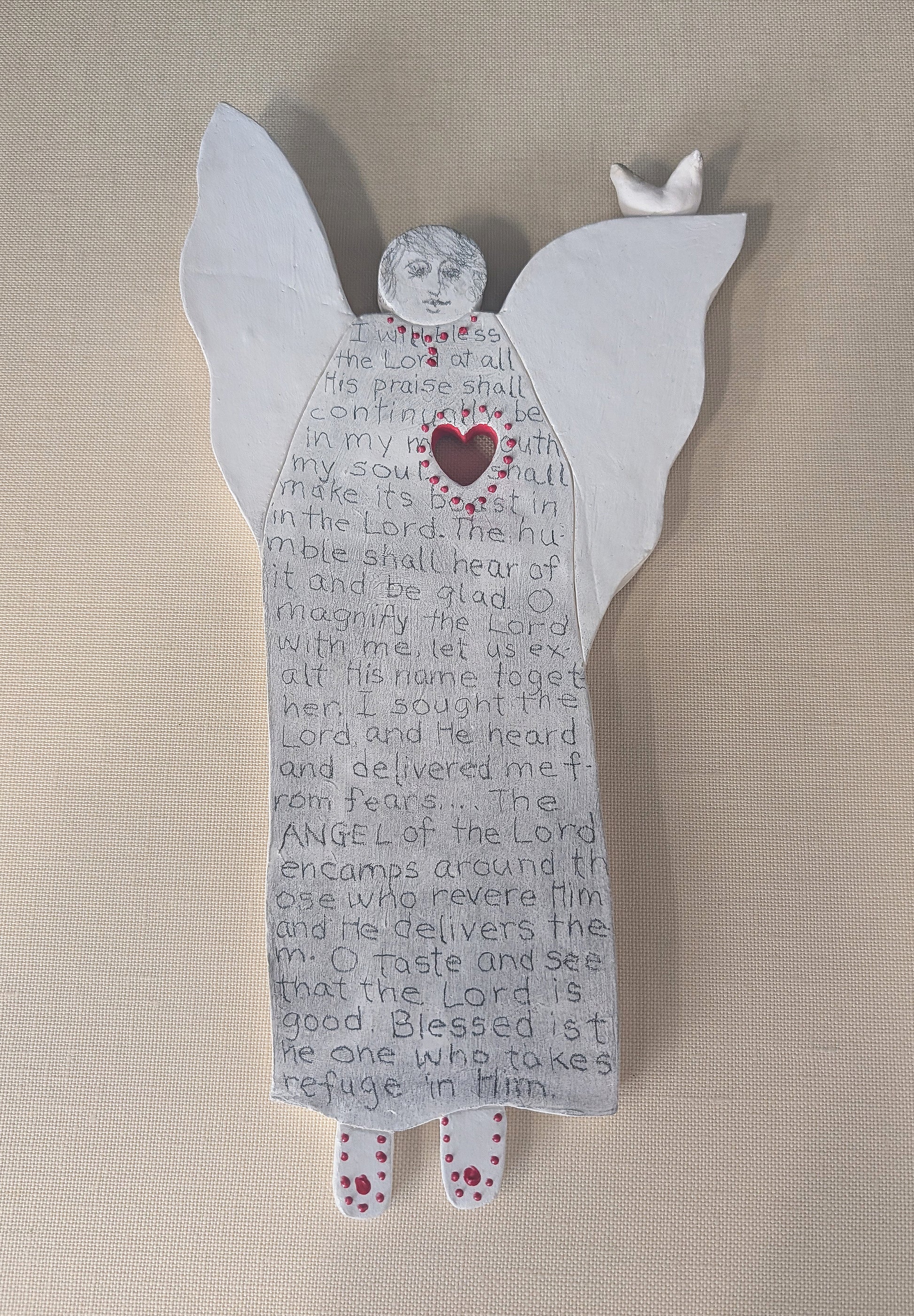 Clay Angel, cat through heart, psalm 34 in pencil, bird on wing. Wall art