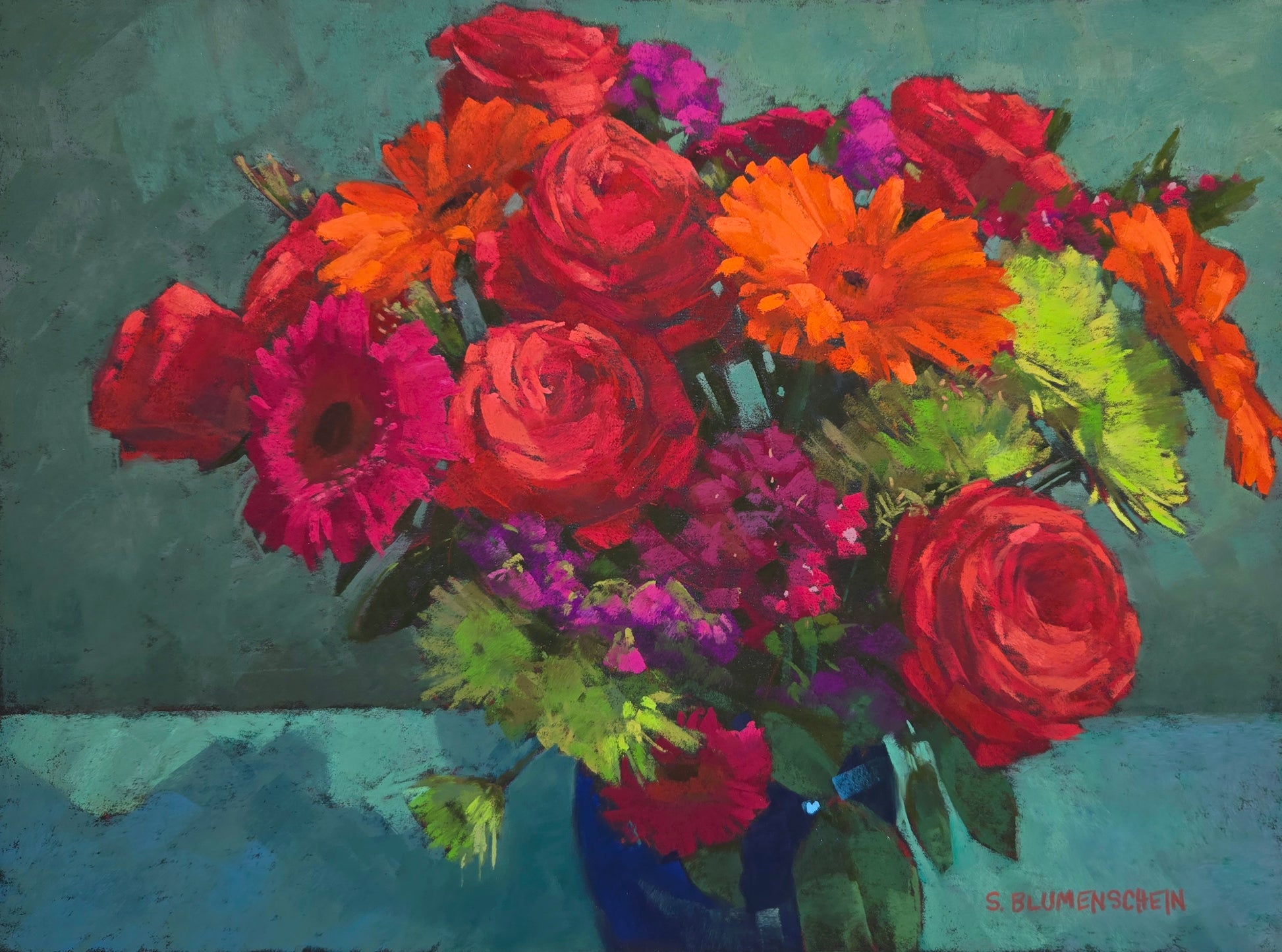 Jewel Tones captures the luminous beauty of a floral arrangement rendered in rich, saturated hues—deep emeralds, sapphires, and amethysts that evoke both elegance and vitality. This pastel painting celebrates the interplay of color and light, with each bloom articulated through layered pigment and subtle tonal shifts. The composition draws the viewer into an intimate study of botanical form, where jewel-toned petals create a harmonious visual symphony. A refined addition to any collection, this work demonstrates the distinctive character that pastel medium brings to still life subjects.