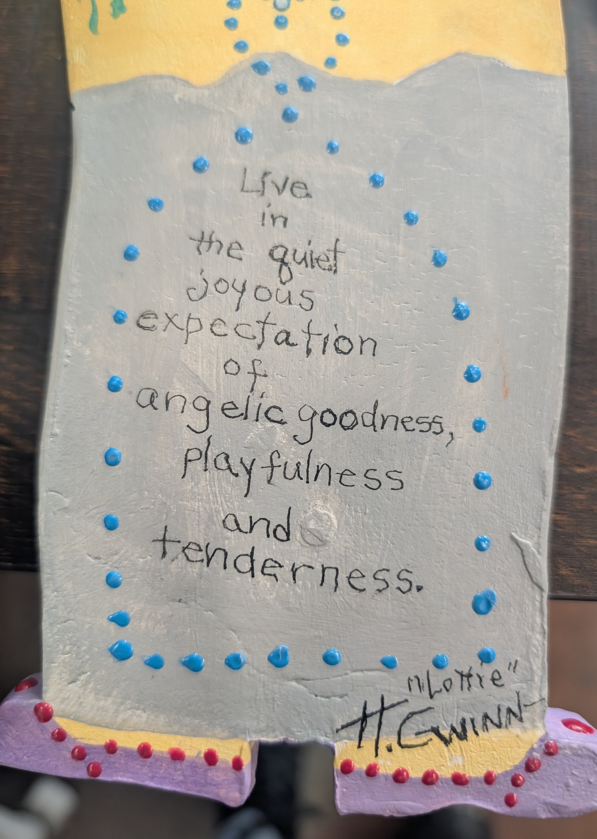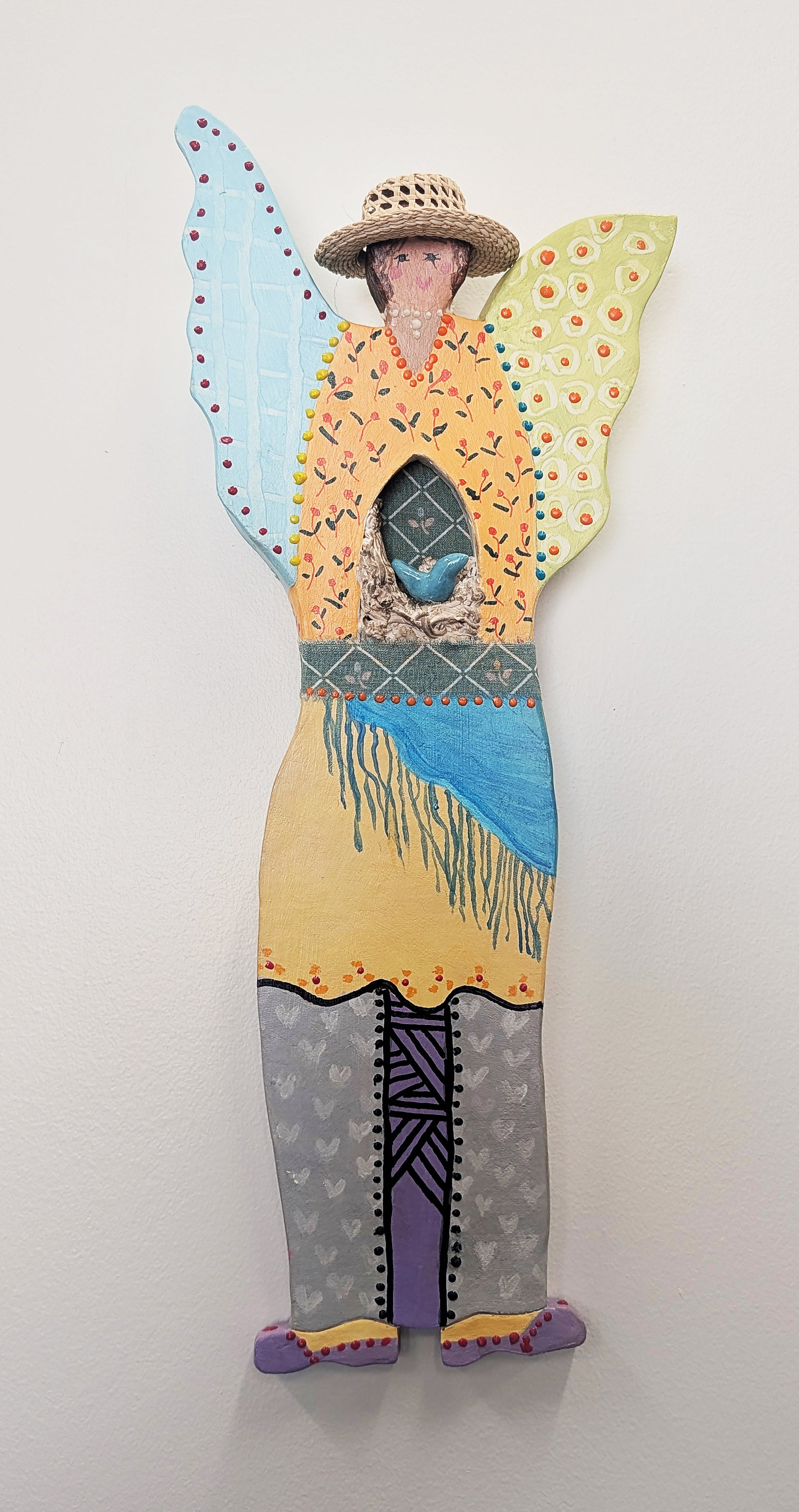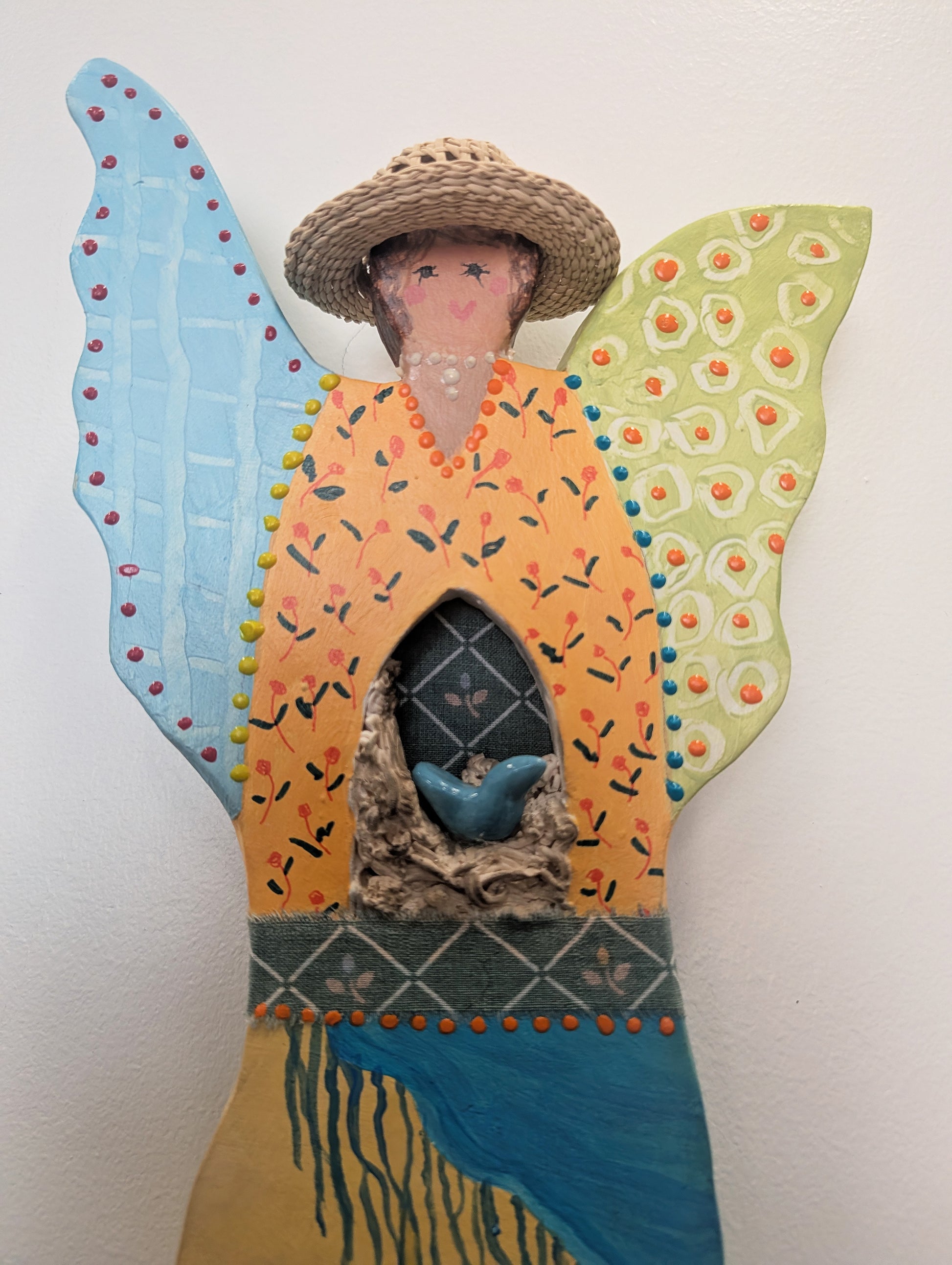 Clay Angel, straw hat, nest, blue bird; Wall art